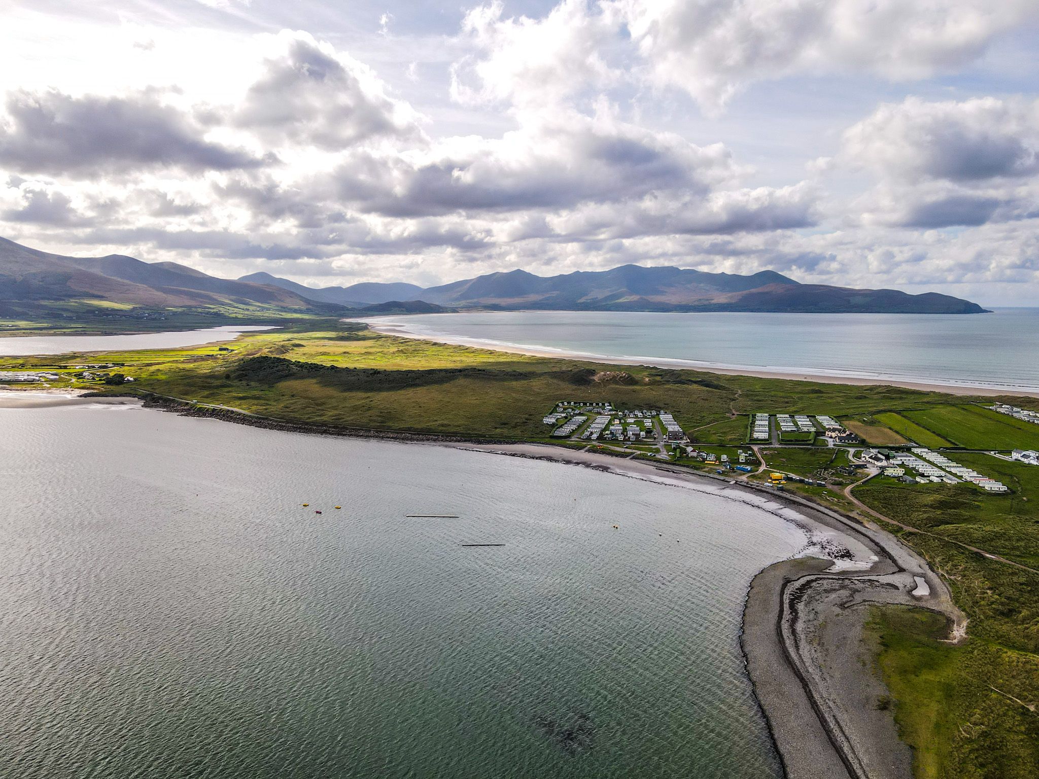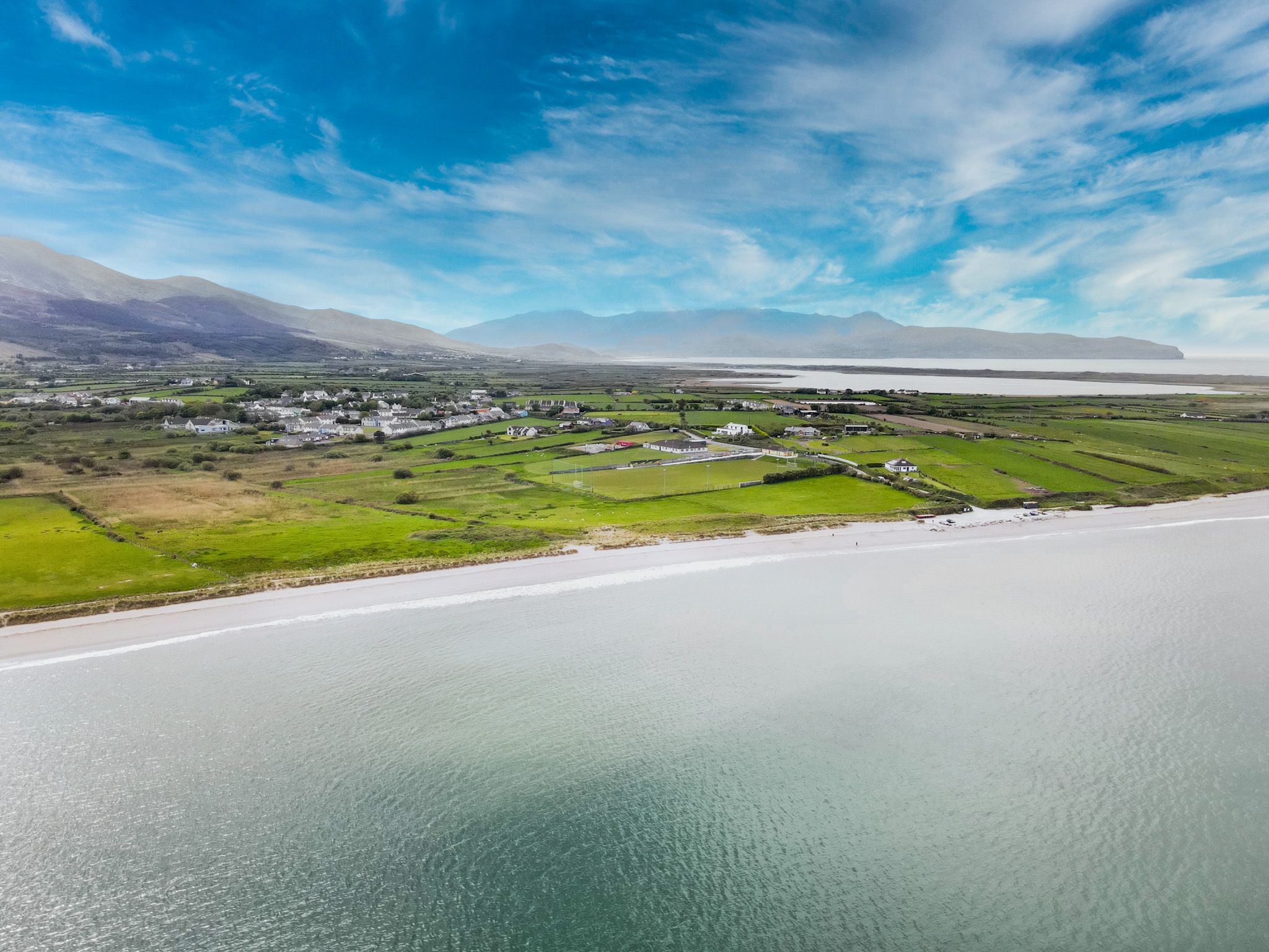 Leaving Castlegregory, head slightly left through the Post Office Square and then left again following the waymarker at the crossroads going south west. Walk on the tarmac road for 1.8km where it then turns into a sand and gravel road and after a caravan park it reaches the tarmac road again at a wide right bend. Head straight on to reach Aughacasla and the main road the R560.