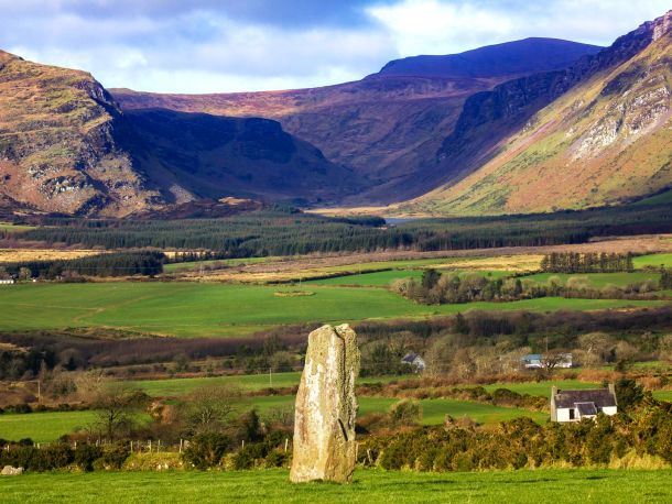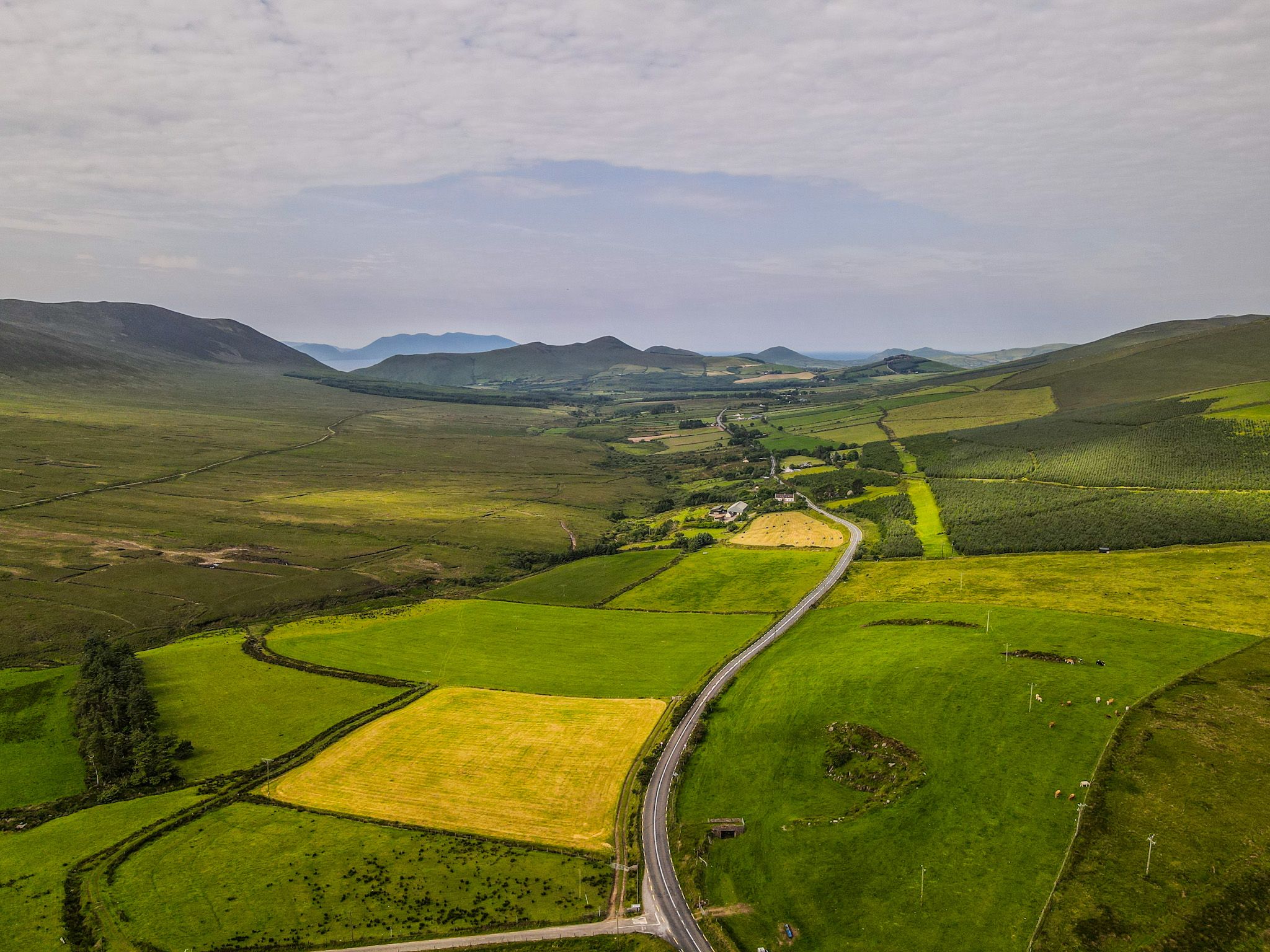 Walking up the old hedge lined road from the intersection south of Camp you come up over the western side of the Slieve Mish Mountains. Soon take a left at a fork in the road and follow it around the upper Emlagh River valley. All around you here you will see signs of peat being cut for fuel. Carry on for 4km going through a small wooded area descending to a junction where you go left. Vehicles use this road so take care.