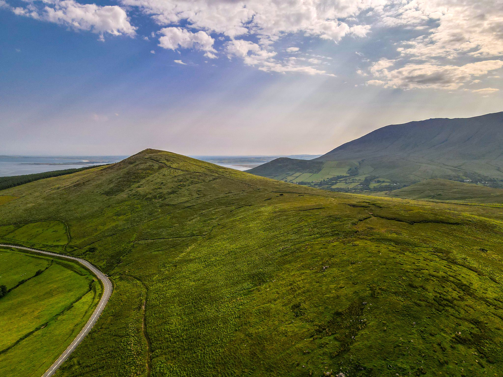 The Way follows an ascending track for a few hundred meters and suddenly descends to a tarmac road. Follow this road for 200m and as this turns into a bohreen keep following, climbing gradually. Cross a stile about 300m further along the Way and then go through a gate.