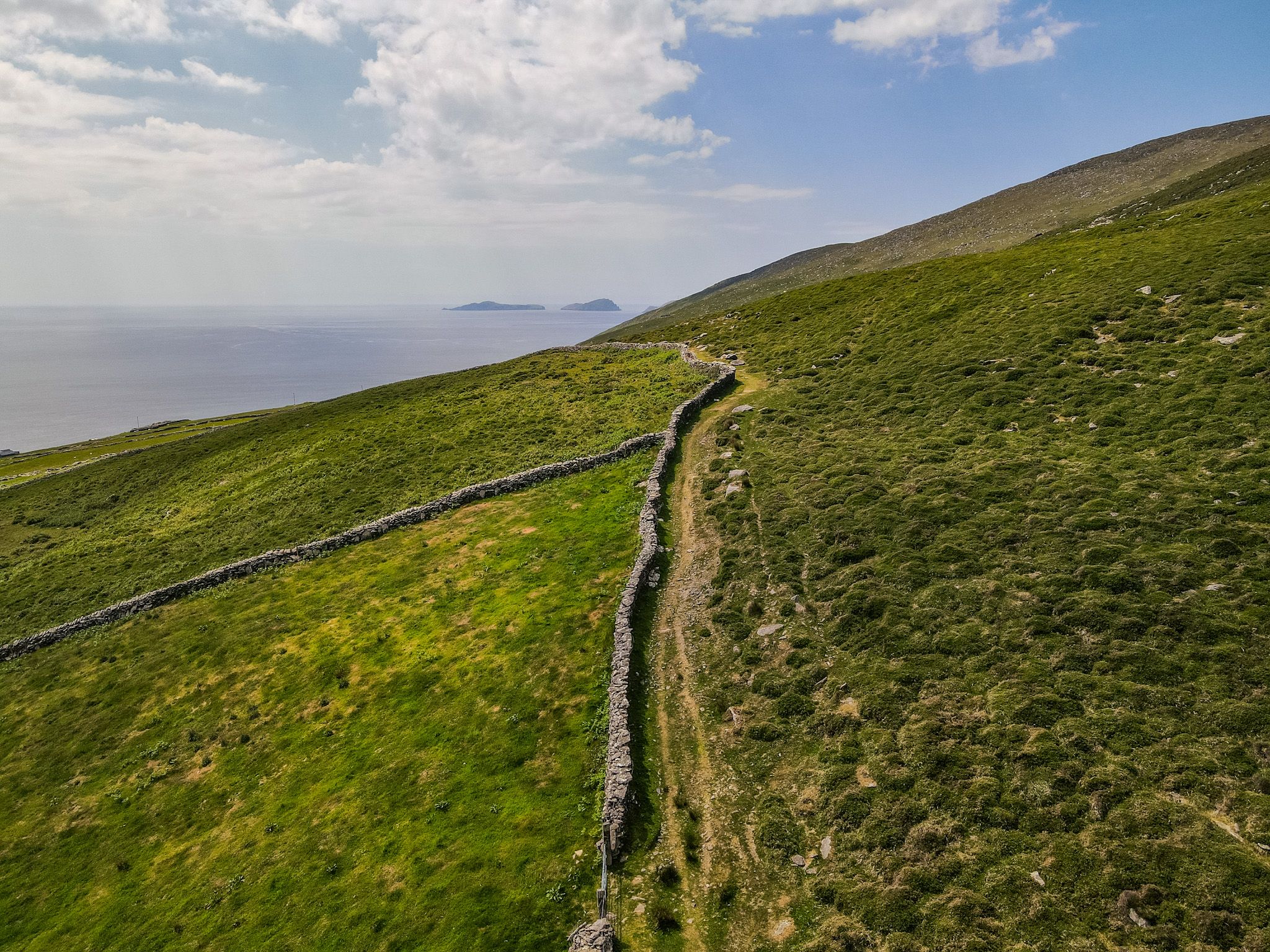 After following some intertwining minor roads and tracks for 2km the Dingle Way then meets the main Slea Head Road. Extreme caution must be taken when walking along this section of the road as it is quite a popular scenic drive and there are no banks on either side to climb and allow room for passing traffic