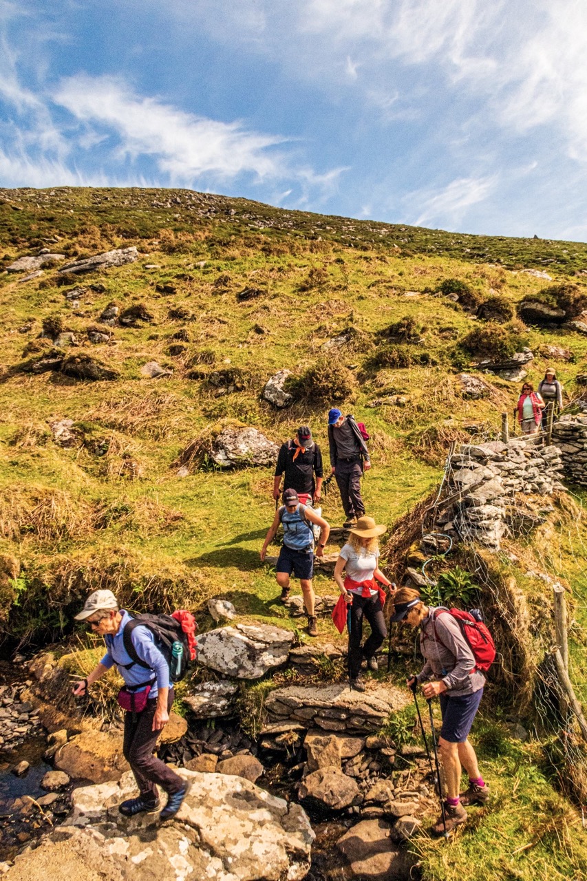 This is a cliff top walk of under two miles which begins and finishes at the car park above Clochar Beach about eight miles west of Dingle. It takes in spectacular sea views and the surrounding countryside and headlands. The walk is flat and has three or four stiles. Easy way-marked way (Blue arrows on a white background)