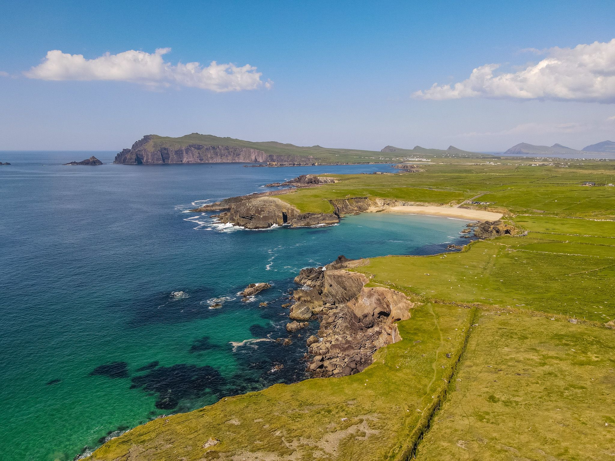 After passing the small picturesque Clochar Beach, which offers views of Inis Tuaisceart (An Fear Marbh/The Dead Man) follow the narrow road back up to the main road for a short period. Then taking a minor road to the left proceed in a north-easterly direction to the east side of Ceann Sibéal golf course. At the end of this road you will come to a T-junction and you veer right and just a few meters along the road you will take a left following the road. You will follow the road to the right at its natural end and from there you will carry on and take another right towards Béal Bán Strand. To your left at the northern side of the strand is Dún an Óir, originally the site of a promontory fort where 600 Italian, Spanish and Irish men were massacred by Elizabethan Crown Forces during the Desmond Rebellion in 1580.
