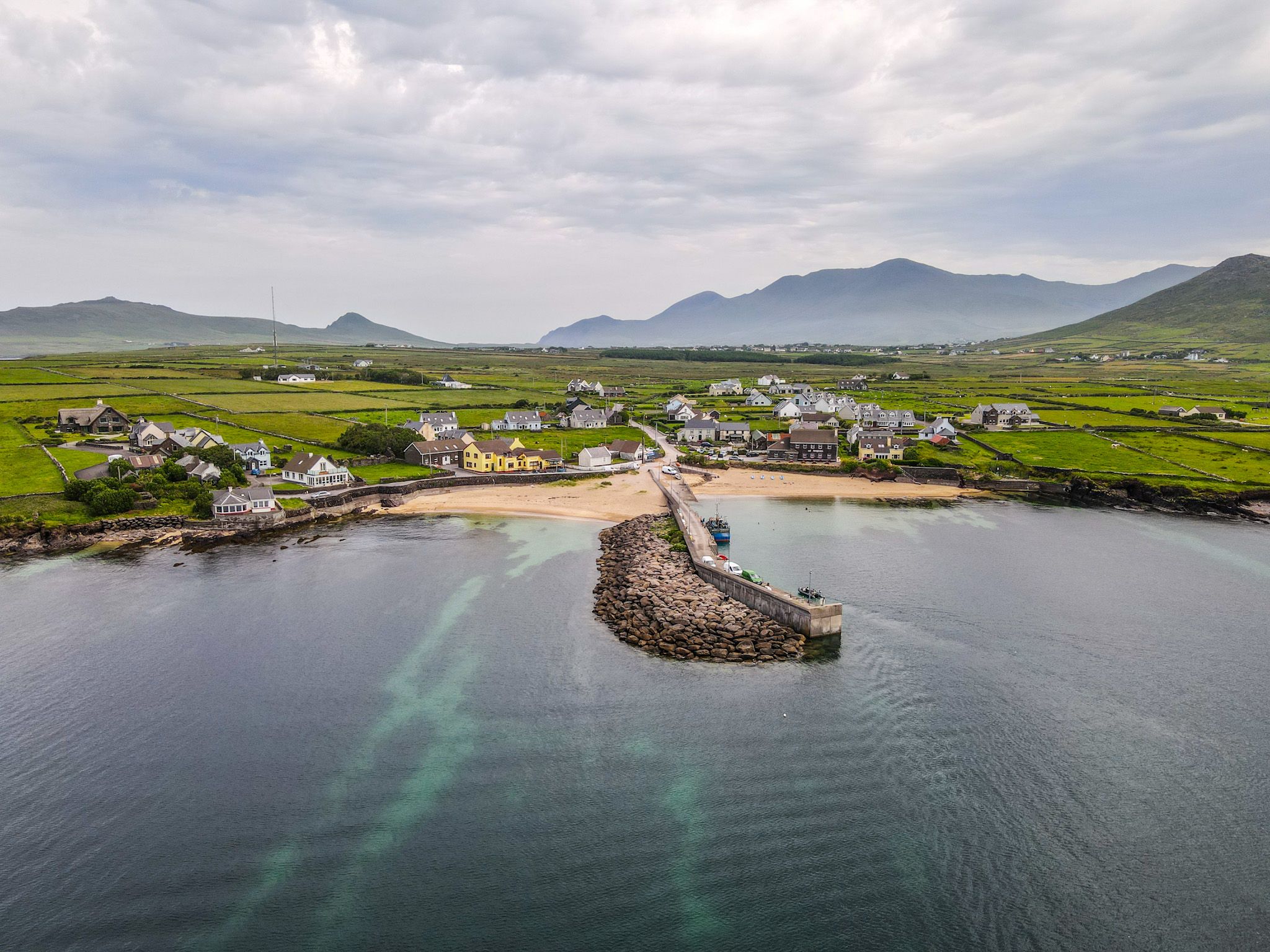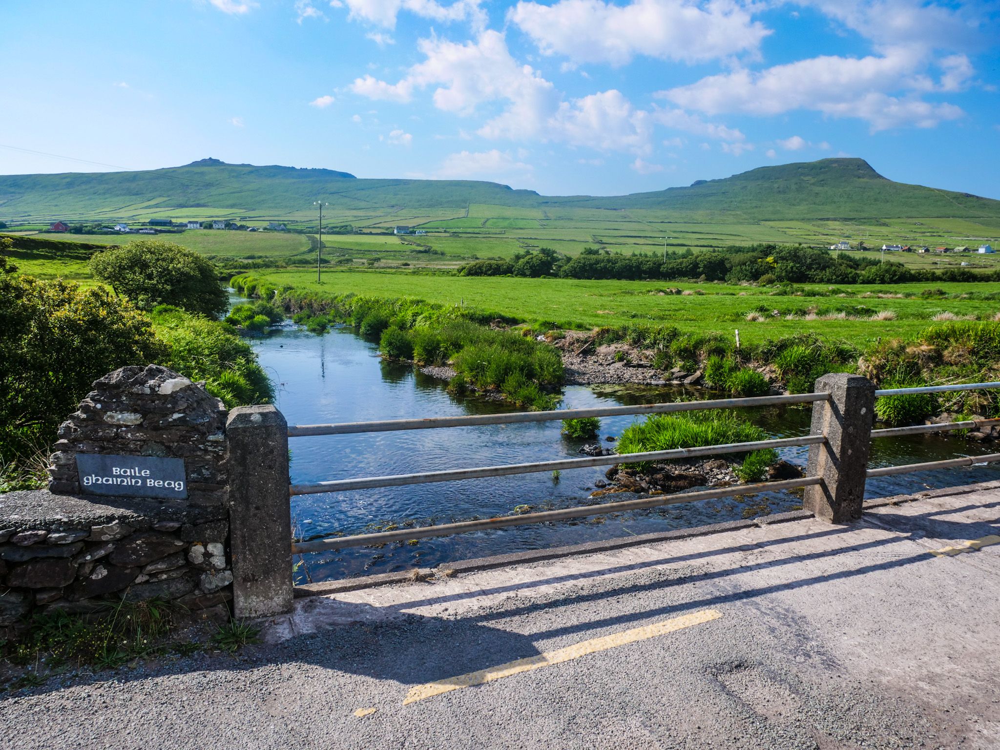 After reaching the road from the beach you will take a left towards the small fishing port of Baile na nGall, taking a left into the village. You will see a path to the left after the village taking in a larger section of cliff-walk, passing a large radio mast belonging to Raidió na Gaeltachta, a station that broadcasts through the Irish language, before it starts to head back inland, rejoining the road at an Ghlaise Bheag. Parts of this cliff walk can be very marshy and slightly flooded depending on weather so care must be taken. Once you reach the main road again you will turn left and walk along the roadside until you reach An Cúinne pub in Feothanach where this section of the walk ends. Brandon Mountain to the north now dominates the next section of the Dingle Way.